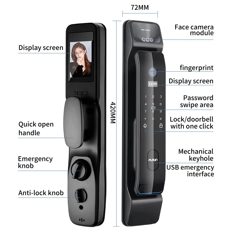 Mint Kínában gyökerező professzionális intelligens zárgyártó és -szállító, a PuXin gazdag tapasztalattal rendelkezik az intelligens ajtózár-iparban, kedvező árelőnyökkel és a legtöbb európai és amerikai piac lefedettségével. A PuXin DF65 3D Face Smart Lock, egy alapvető biometrikus termék, nagy pontosságú binokuláris infravörös arcfelismerő algoritmussal és kiváló minőségű felületfeldolgozással rendelkezik, amely hatékony feloldást, tartósságot és antisztatikus teljesítményt biztosít.
