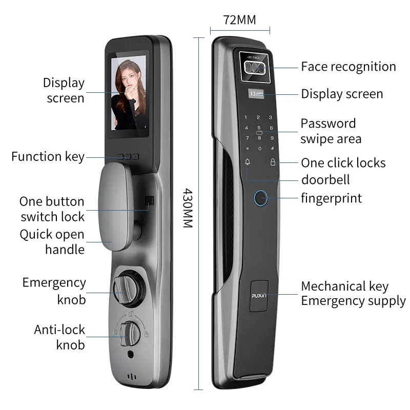 Az 1 millió pixeles macskaszem kamerával és 1080P HD képernyővel felszerelt PuXin Q19 Cat Eye Smart Lock megbízható vizuális megfigyelő rendszert alkot. A felhasználók éjjel-nappal tisztán láthatják a helyzetet az ajtón kívül, elkerülve a hagyományos macskaszemek biztonsági kockázatait, és növelve az otthoni és irodai biztonságot.